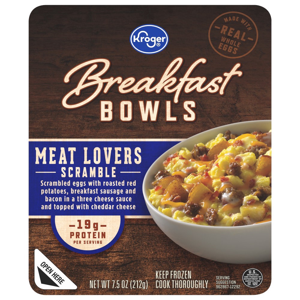Kroger® Meat Lovers Scramble Breakfast Bowl bursts with a tasty mix of scrambled eggs, zesty breakfast sausage, crispy bacon, and savory roasted red potatoes. Smothered in a smooth three cheese sauce …