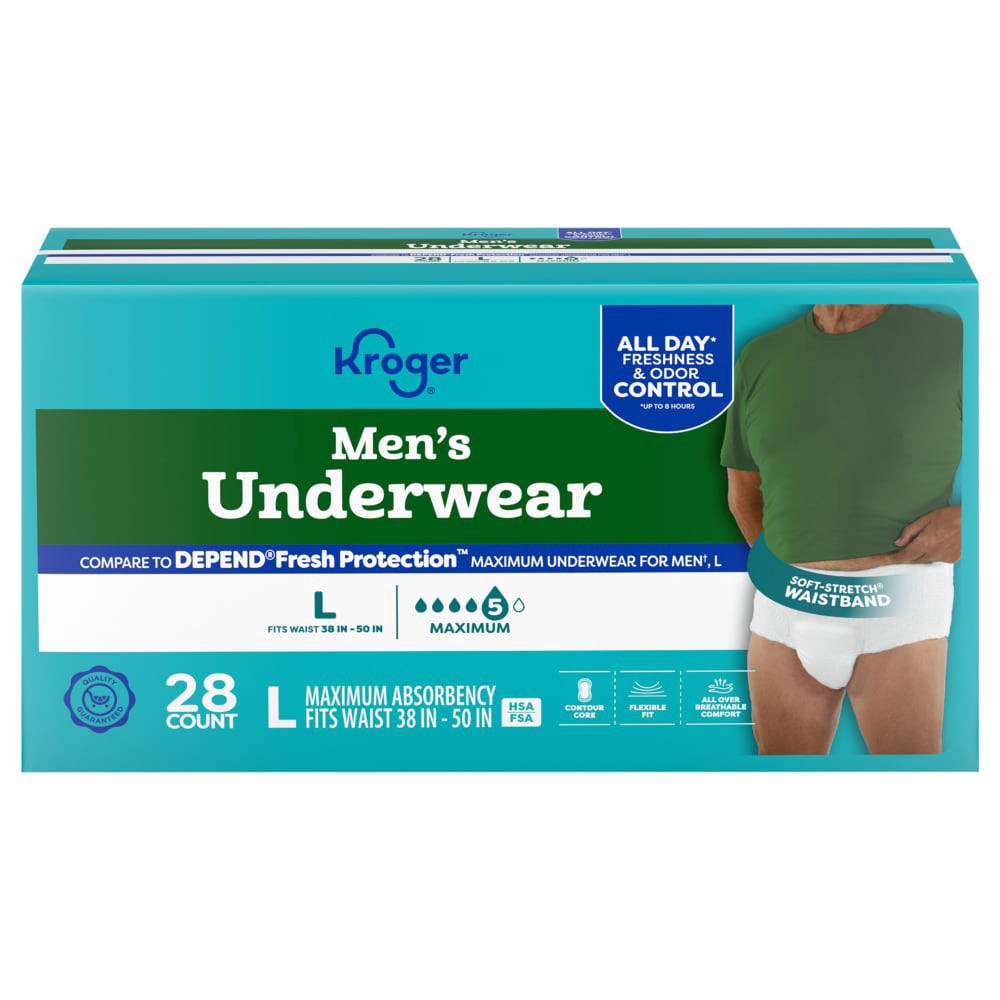 Kroger® Underwear for Men Maximum Absorbency Large ensures all dayˆ freshness and odor control. Crafted for a snug fit with a Soft-Stretch® Waistband, these underwear comfortably fit waists sized 38 i…