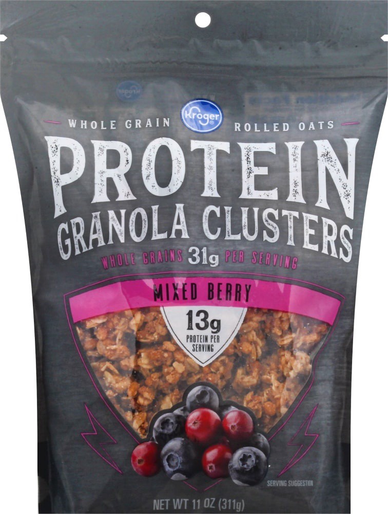 Kroger® Mixed Berry Protein Granola Cereal Clusters combines whole grain oats, protein-rich soy, sweet cranberries, and ripe blueberries. Perfect for busy weekday breakfasts, leisurely weekend brunche…