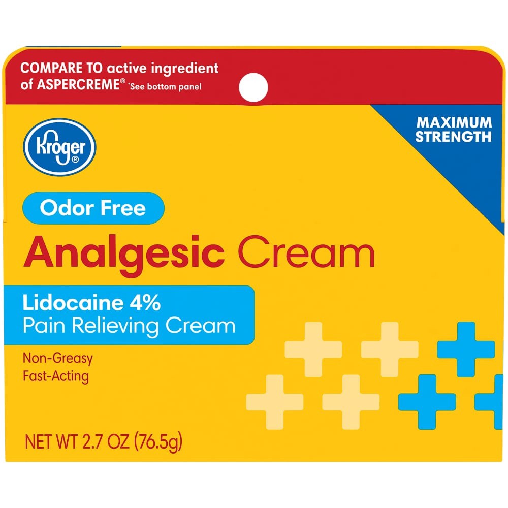 Use Kroger Analgesic + Lidocaine Cream for temporary relief of pain.Non-irritatingNon-greasyFast-actingOdor FreeProvides temporary relief of painContains 4% Lidocaine HCI