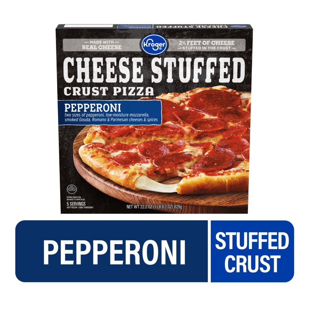 Kroger® Pepperoni Stuffed Crust PizzaTwo sizes of pepperoni, low moisture mozzarella, smoked Gouda, Romano & Parmesan cheese & spices.