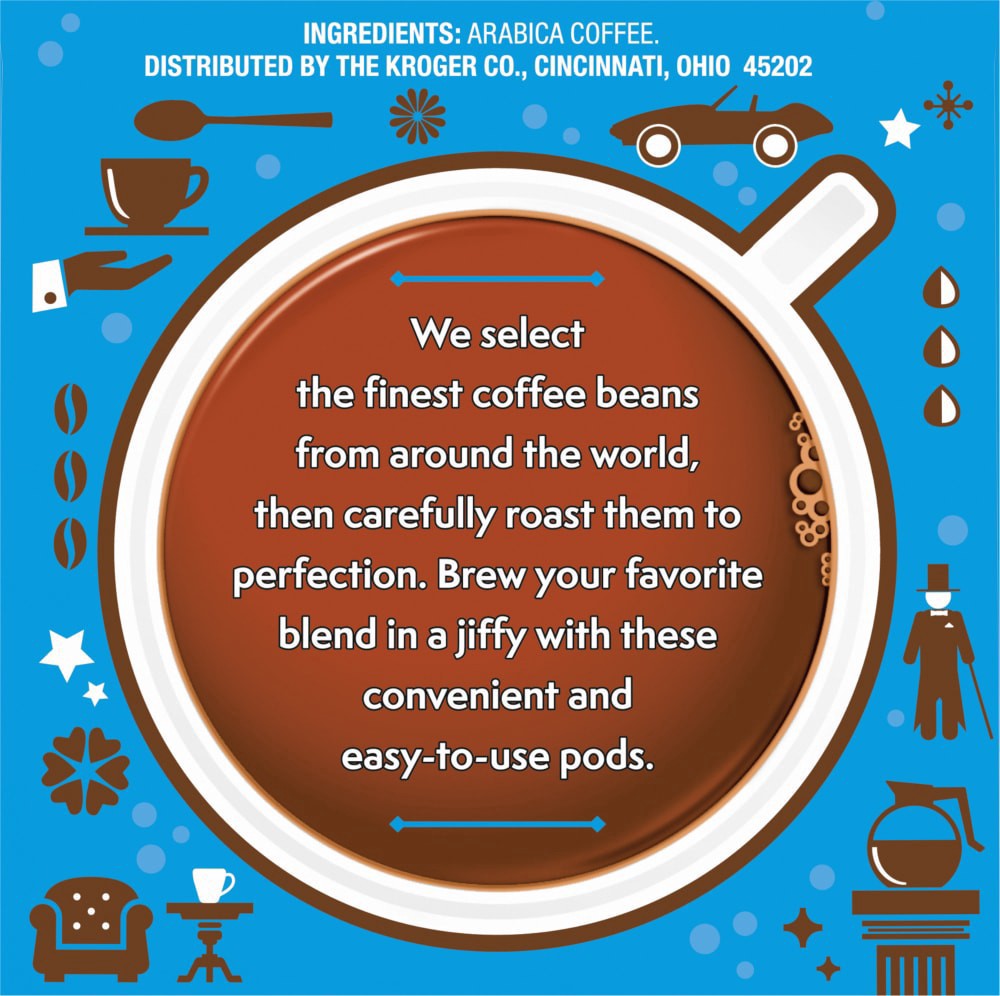 Kroger® Premium Blend Medium Roast Coffee Pods burst with a rich & balanced flavor guaranteed to kick-start your day. Each coffee pod packs a punch of medium roast character. Containing 100% arabica c…