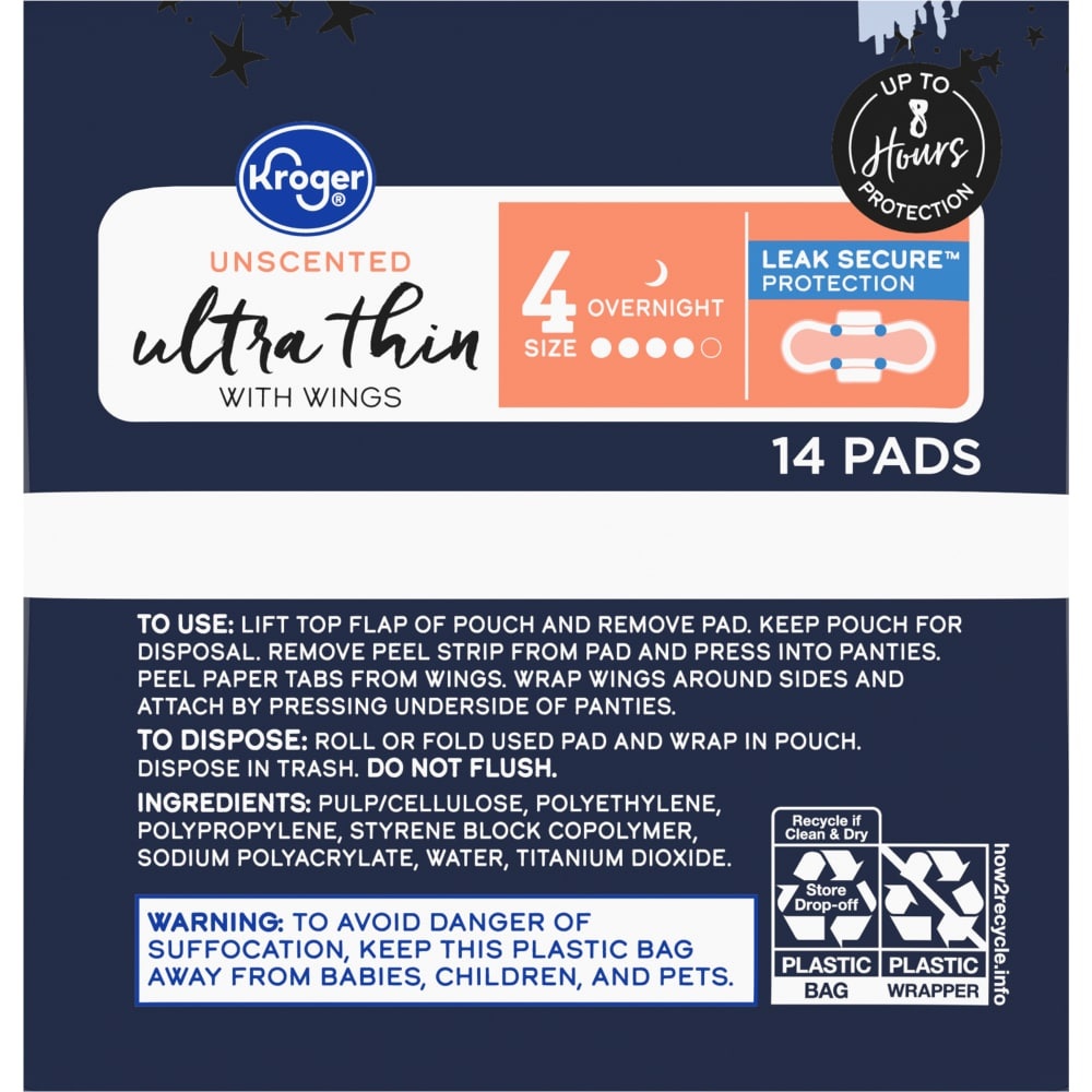 Kroger® Ultra Thin Pads with Wings Overnight Size 4 Unscented are excellent for comfort and feature leak secure® protection. Experience up to 8 hours of protection against leaks, thanks to these overn…