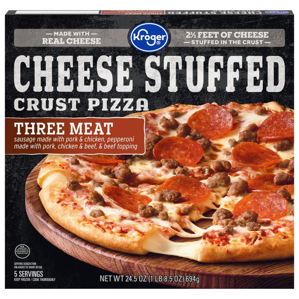 Kroger® Three Meat Cheese Stuffed Crust Frozen Pizza is all about tasty fun. Our soft, doughy crust is stuffed with a blend of ooey-gooey mozzarella, Romano and Asiago cheeses. A zesty sauce, sausage,…