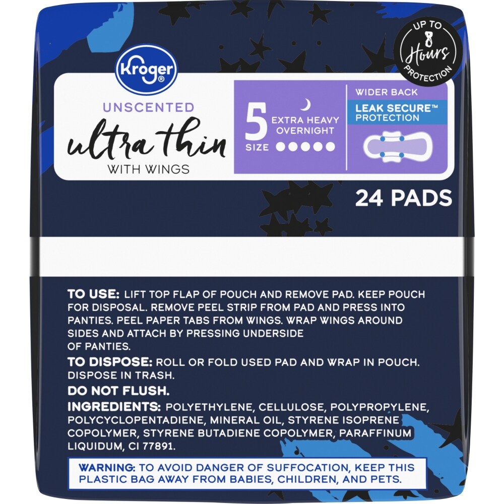 Kroger® Ultra Thin Pads with Wings Extra Heavy Overnight Size 5 Unscented are excellent for comfort and feature leak secure® protection. Experience up to 8 hours of protection against leaks, thanks to…
