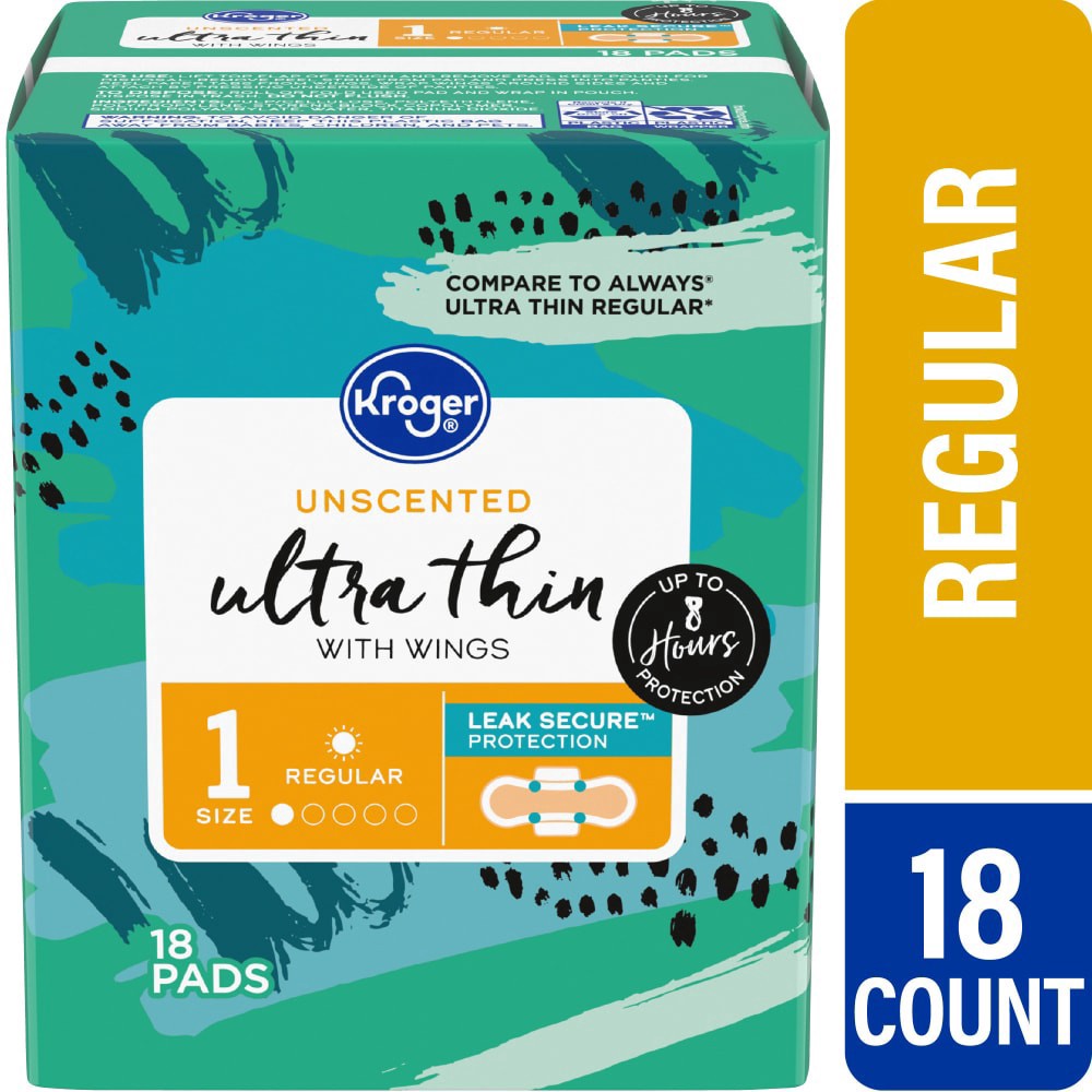 Kroger® Ultra Thin Pads with Wings Regular Size 1. Unscented are excellent for comfort and feature leak secure® protection. Experience up to 8 hours of protection against leaks, thanks to its fast-abs…