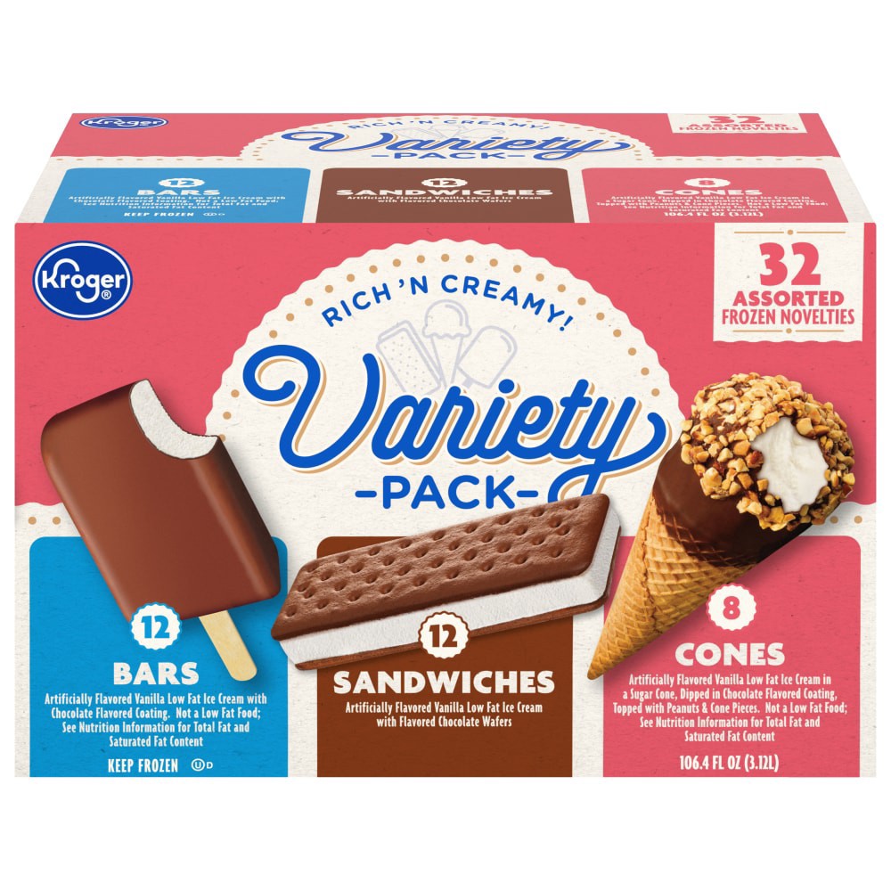 Kroger® Variety Pack Assorted Frozen Novelties opens up a world of dessert possibilities! With 12 bars, 12 sandwiches, and 8 cones, serving up smiles is easy. Create imaginative desserts or enjoy thes…