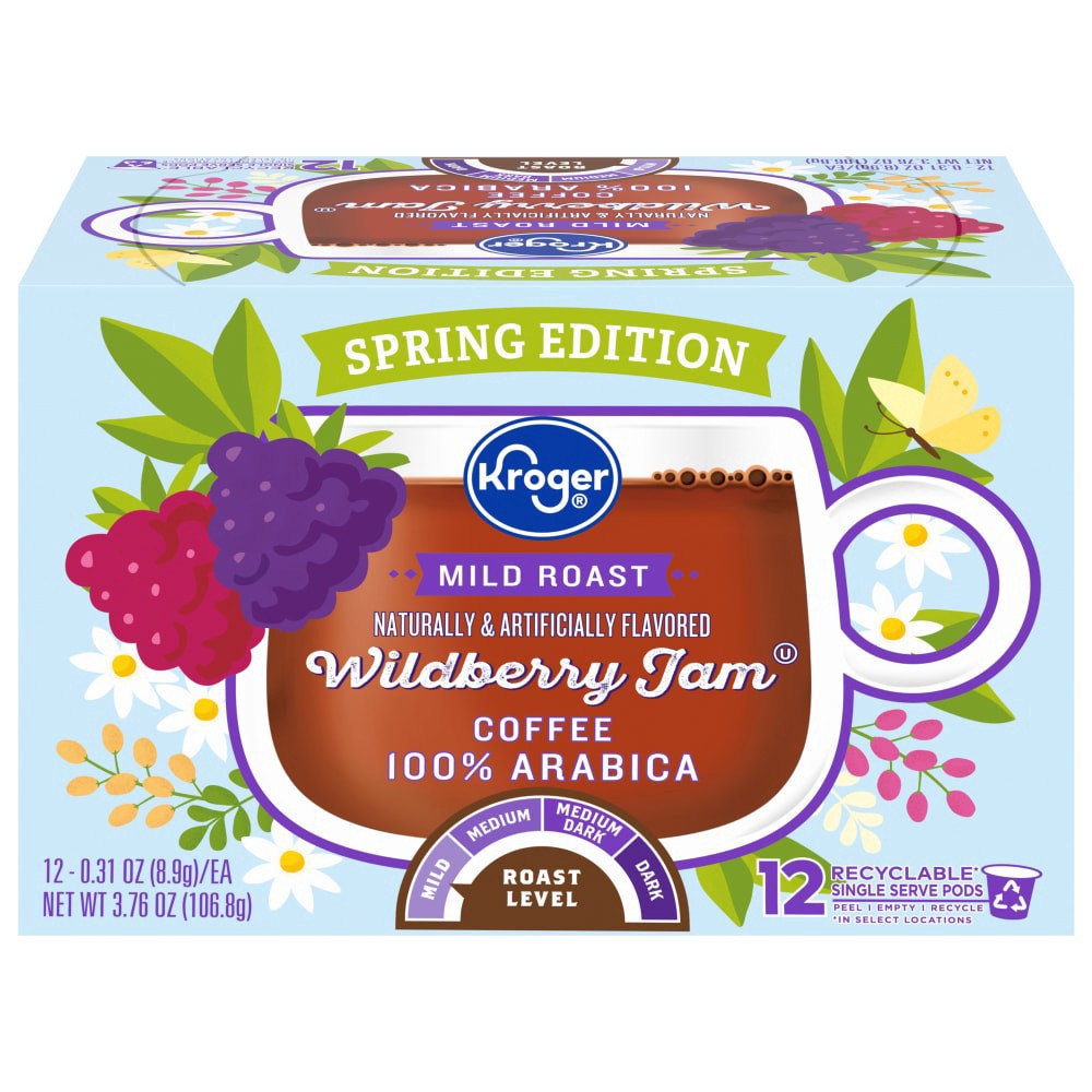 Kroger® Mild Roast Wildberry Jam Coffee Pods burst with the sweet taste of dark berry fruit, teasing your taste buds. A wonderful hint of baked pastry flavor sings in the background, creating a sympho…