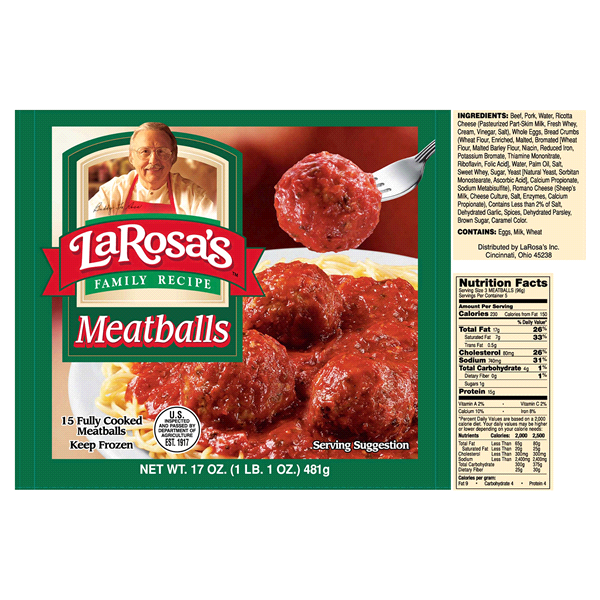 Beef, Pork, Water, Ricotta Cheese (Pasteurized Part-Skim Milk, Fresh Whey, Cream, Vinegar, Salt), Whole Eggs, Bread Crumbs (Wheat Flour, Enriched, Malted, Bromated [Wheat Flour, Malted Barley Flour, N…