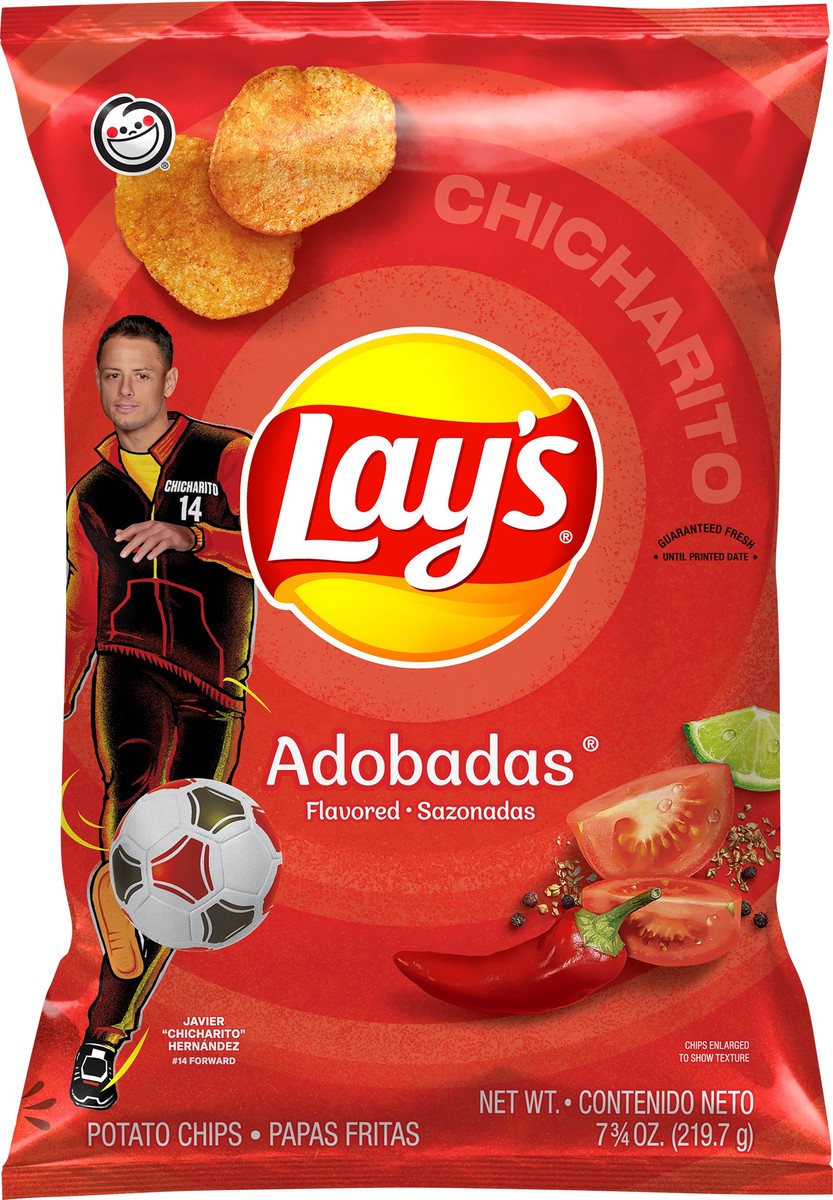 No artificial flavors. Chicharito. Javier Chicharito Hernandez. (hashtag)14 forward. Smoky. Spicy. Crispy. Delicioso. Lays.com. Facebook. Twitter. Find us on Lays.com. SmartLabel: Scan for more food i…