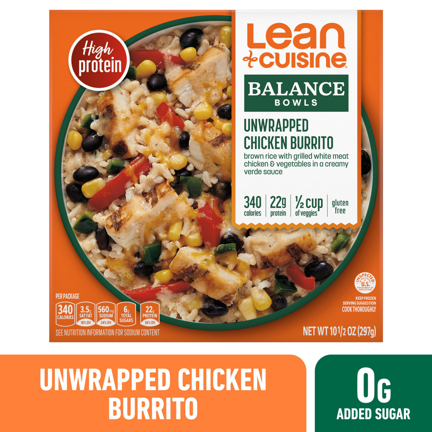 Eat what you love with a Lean Cuisine Balance Bowls Unwrapped Chicken Burrito Frozen Meal. At 340 calories and 22 grams of protein per package, this easy-to-make Lean Cuisine chicken burrito features …