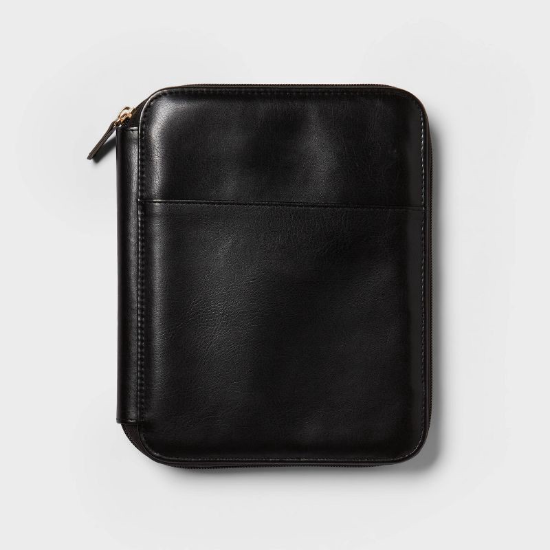 Securely hold your notes, essential documents and tech gadgets in one place using this Leather Zip Tech Case from Threshold™. This rectangular case is designed in a black hue and features 120 college-…