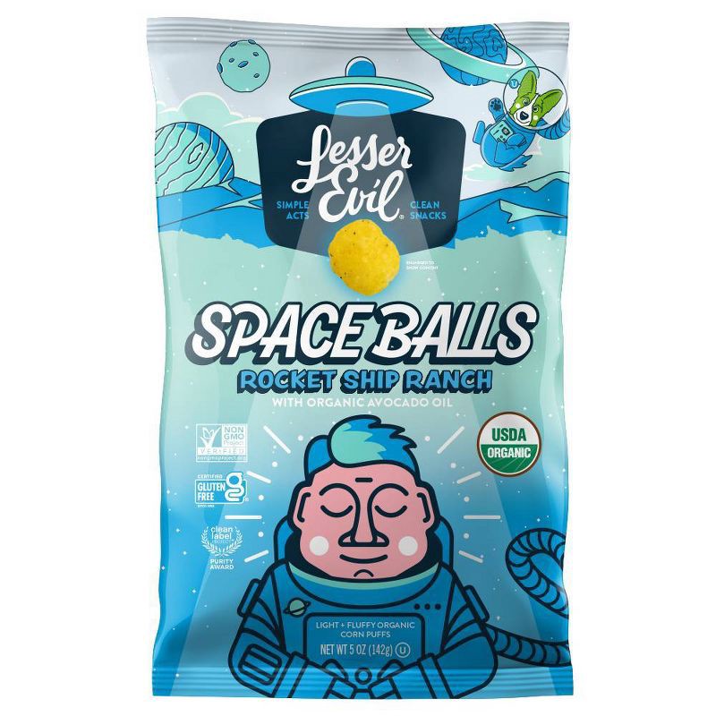 - This 5 oz bag of LesserEvil Space Balls, Ranch Rocket Ship, is a simple 130 calories per serving, making it a satisfying snack you can feel zen about. Packaging may vary.