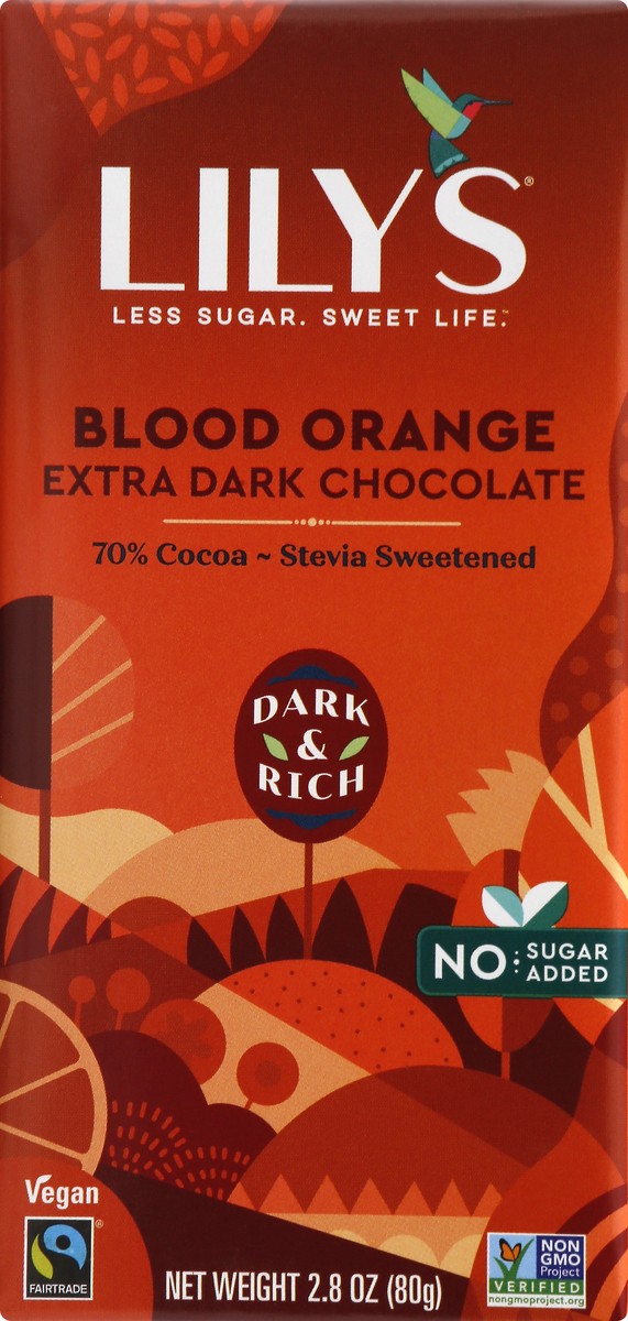 Unsweetened Cocoa, Erythritol, Inulin, Cocoa Butter, Orange Peel, Blood Orange Oil, Organic Soy Lecithin, Sunflower Lecithin, Vanilla Extract, Stevia Extract.