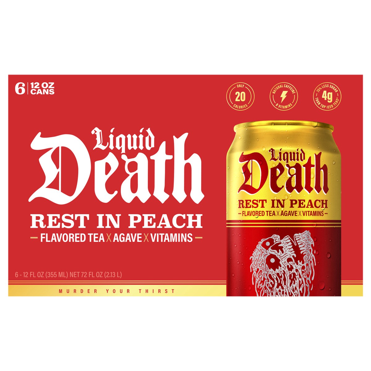 Liquid Death, Rest in Peach Iced Tea, Peach Flavored Back Tea