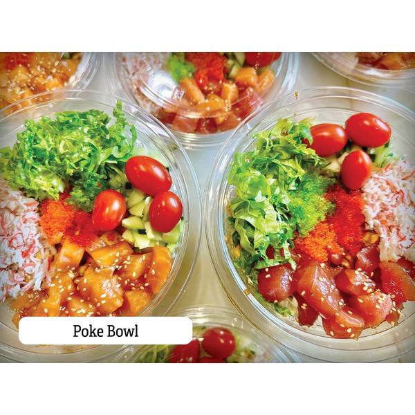 White Sushi Rice, Poke Tuna, Poke Salmon, Lettuce, Avocado, Cucumber, Carrot, Poke Sauce, Tobiko. Raw Fish
