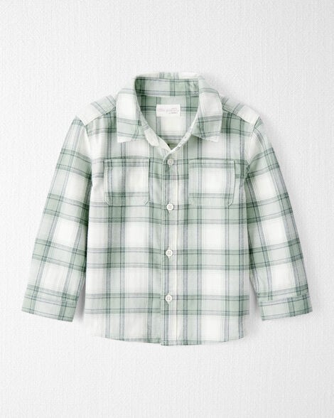 Littleplanet Toddler Organic Cotton Herringbone Button-Front Shirt in Plaid Green, Ivory 5T