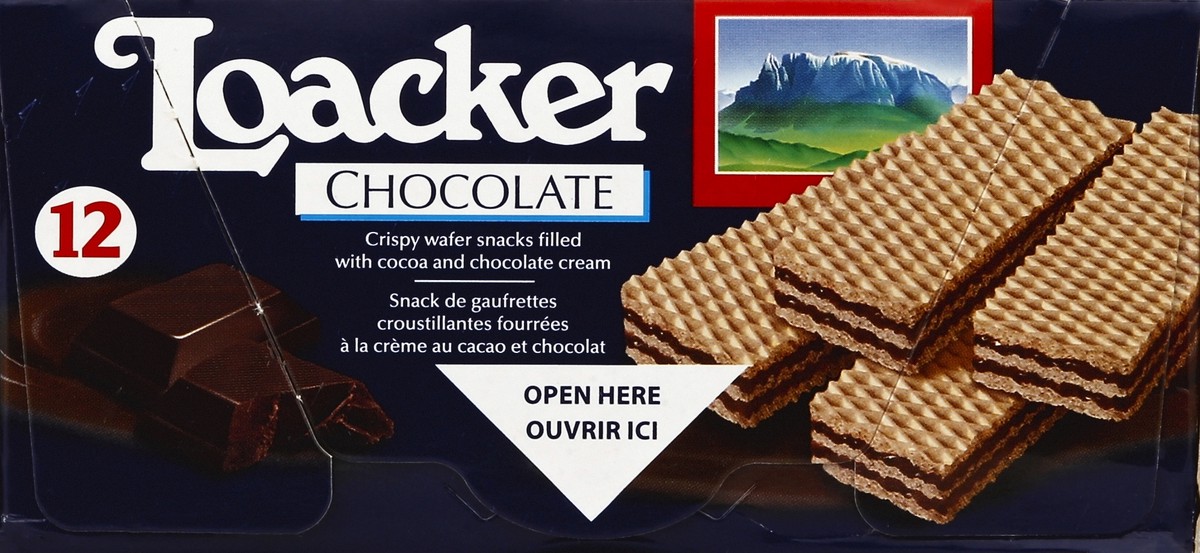 Crispy wafer snacks filled with cocoa and chocolate cream. 12 snack packs. With natural ingredients. The Sciliar mountain, part of the brand logo, as seen from the Loacker headquarter in Italy. Loacke…