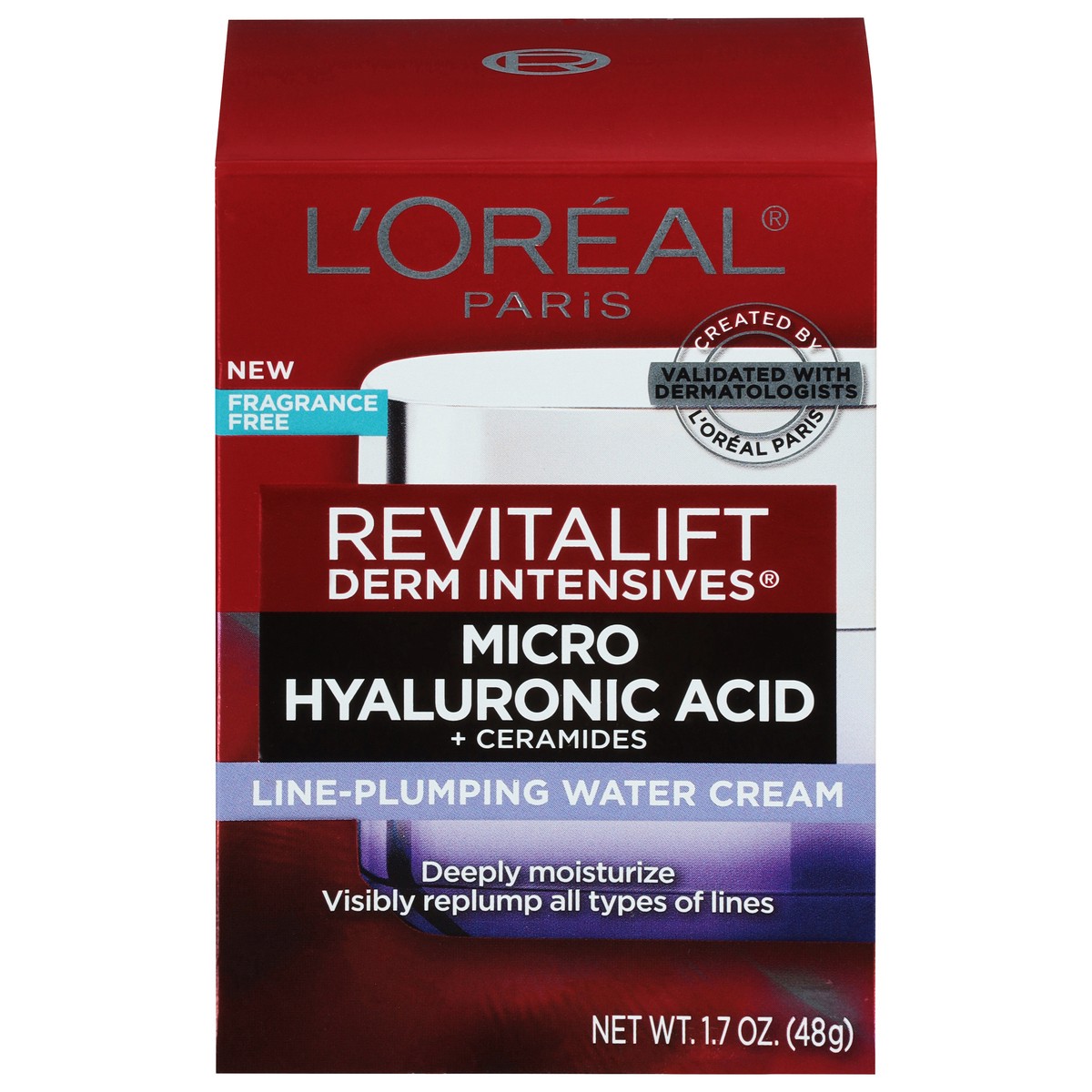 L’ Oreal Paris. New. Created by validated with dermatologists. Revitalift derm intensives. Micro hyaluronic acid + ceramides. Line-plumping water cream. Deeply moisturize. Visibly replump all types of…