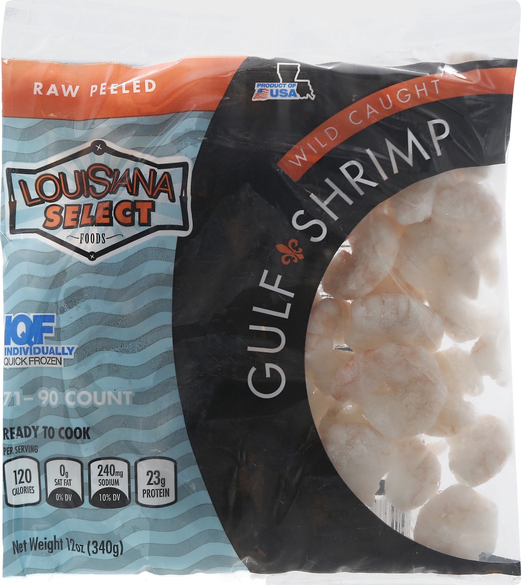 71-90 count. Per Serving: 120 calories; 0 g sat fat (0% DV); 240 mg sodium (10% DV); 23 g protein. Raw peeled. IQF: Individually Quick Frozen. Ready to cook. louisianaselectfoods.com. Find us on web l…