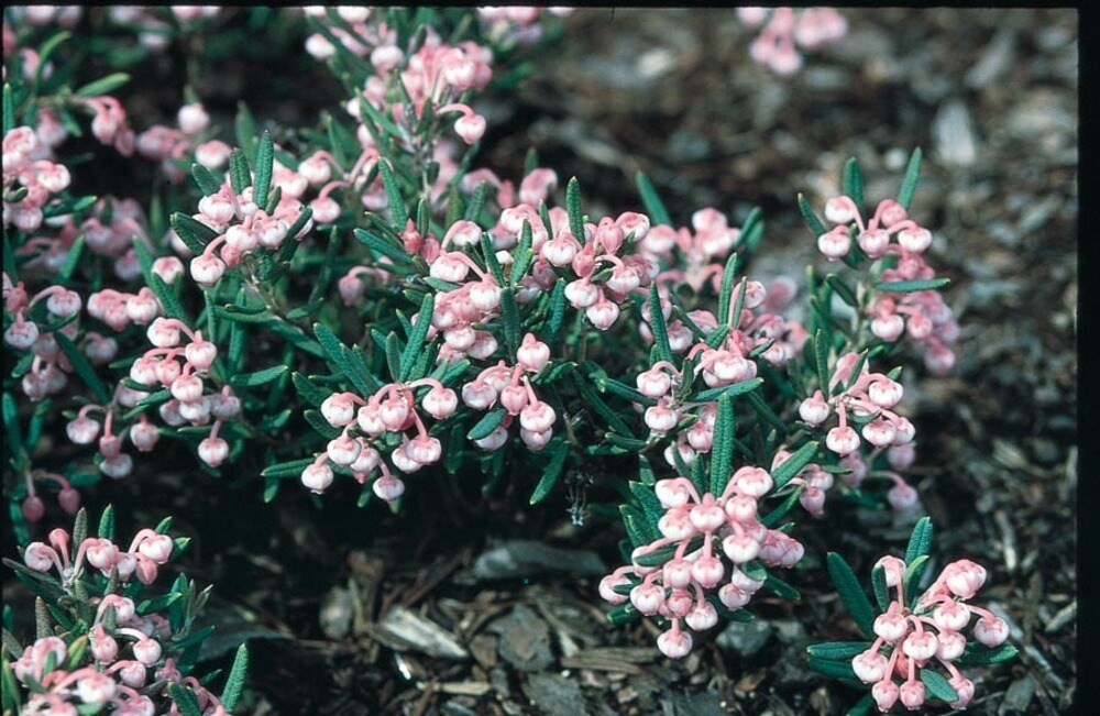 Bog rosemary flowering shrub is ideal as groundcover. Dwarf habit displays icy-blue leaves and masses of pink, bell-shaped flowers that bloom in early spring. Thrives in moist soils and partly sunny a…