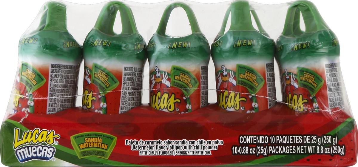 Watermelon flavor lollipop with chili powder. Artificially flavored. For Nutritional Information: USA 1-866-58Lucas. www.Lucas.com.mx. Shake it & enjoy it. Made in Mexico.