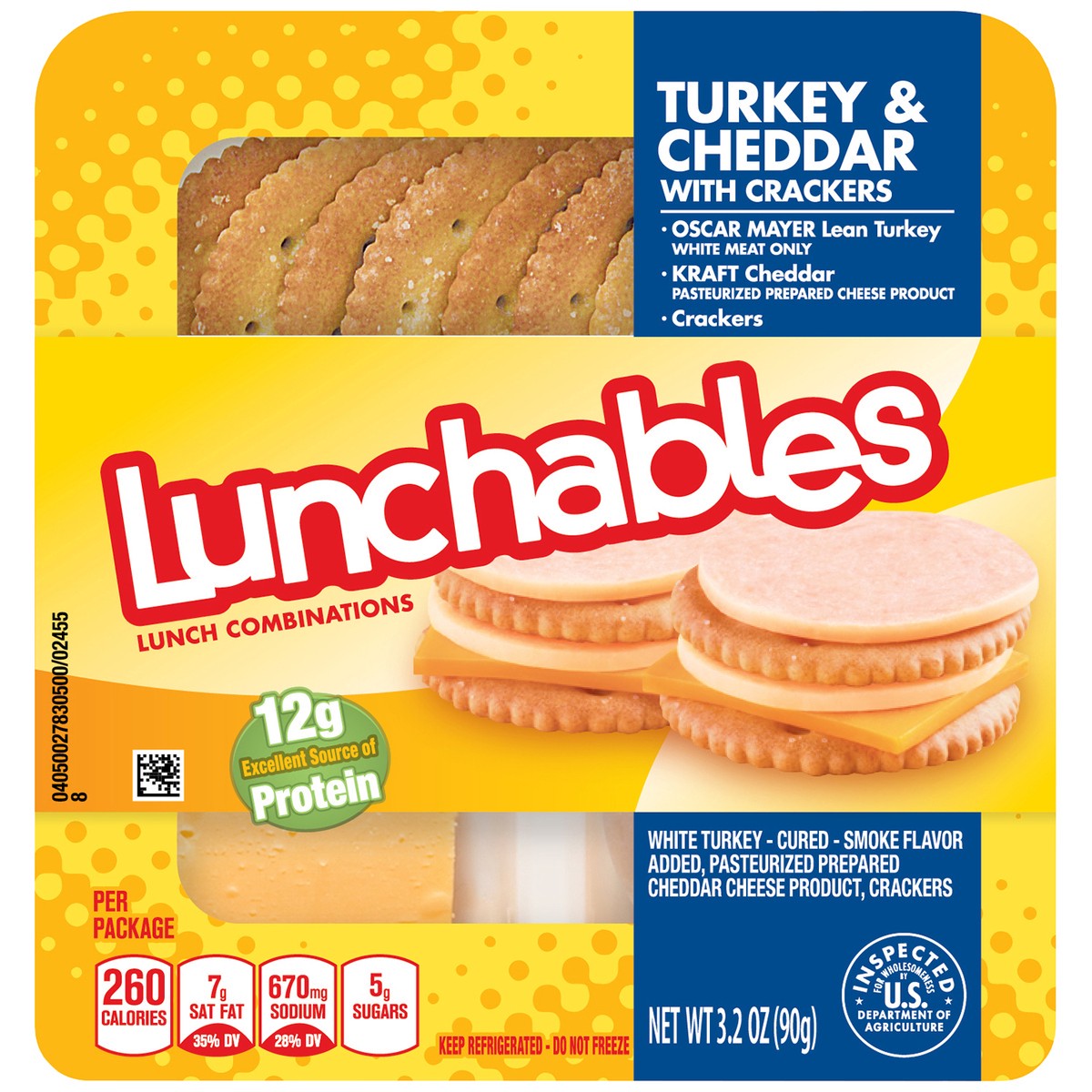 Lunchables Turkey and Cheddar with Crackers Lunch Combinations are the perfect on-the-go lunch while letting kids have fun with their food. Each convenient lunch kit includes Oscar Mayer White Meat Le…