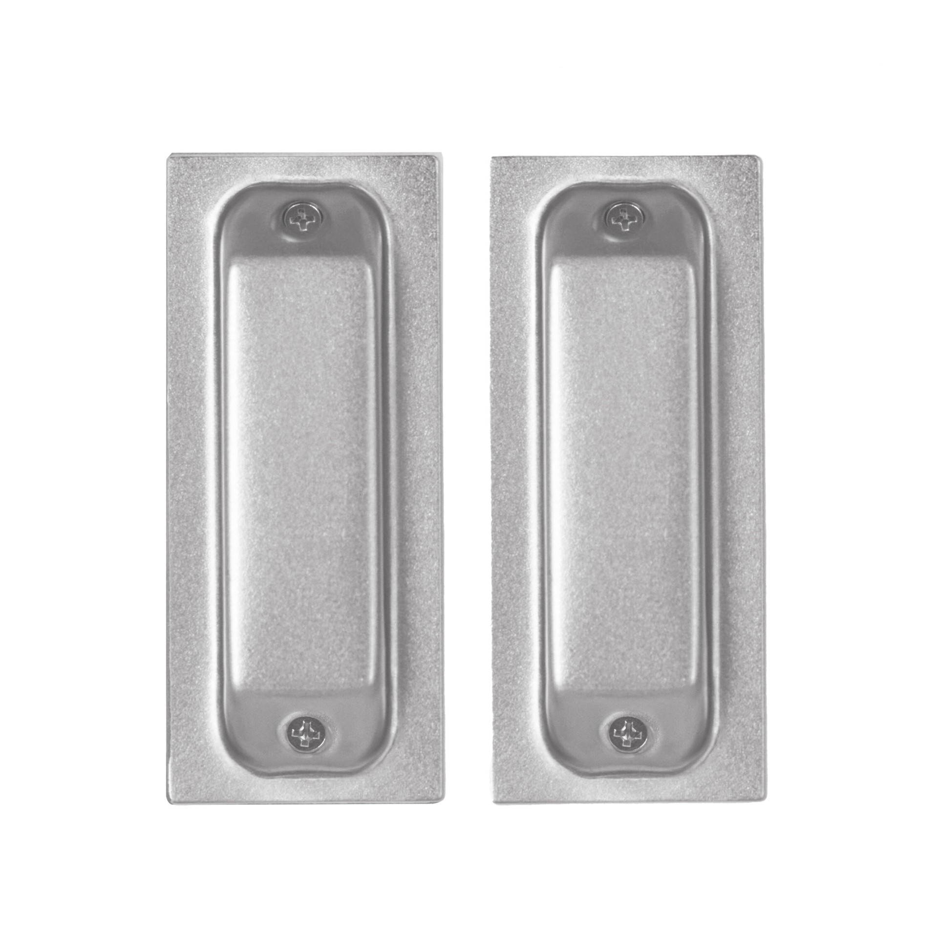 Use flush rectangle pull on any sliding doors. Steel plated for long lasting durability. 3-1/4" tall. Steel. Satin Nickel finish. Attach with Phillips Head screwdriver. Sold in packs of two, perfect f…