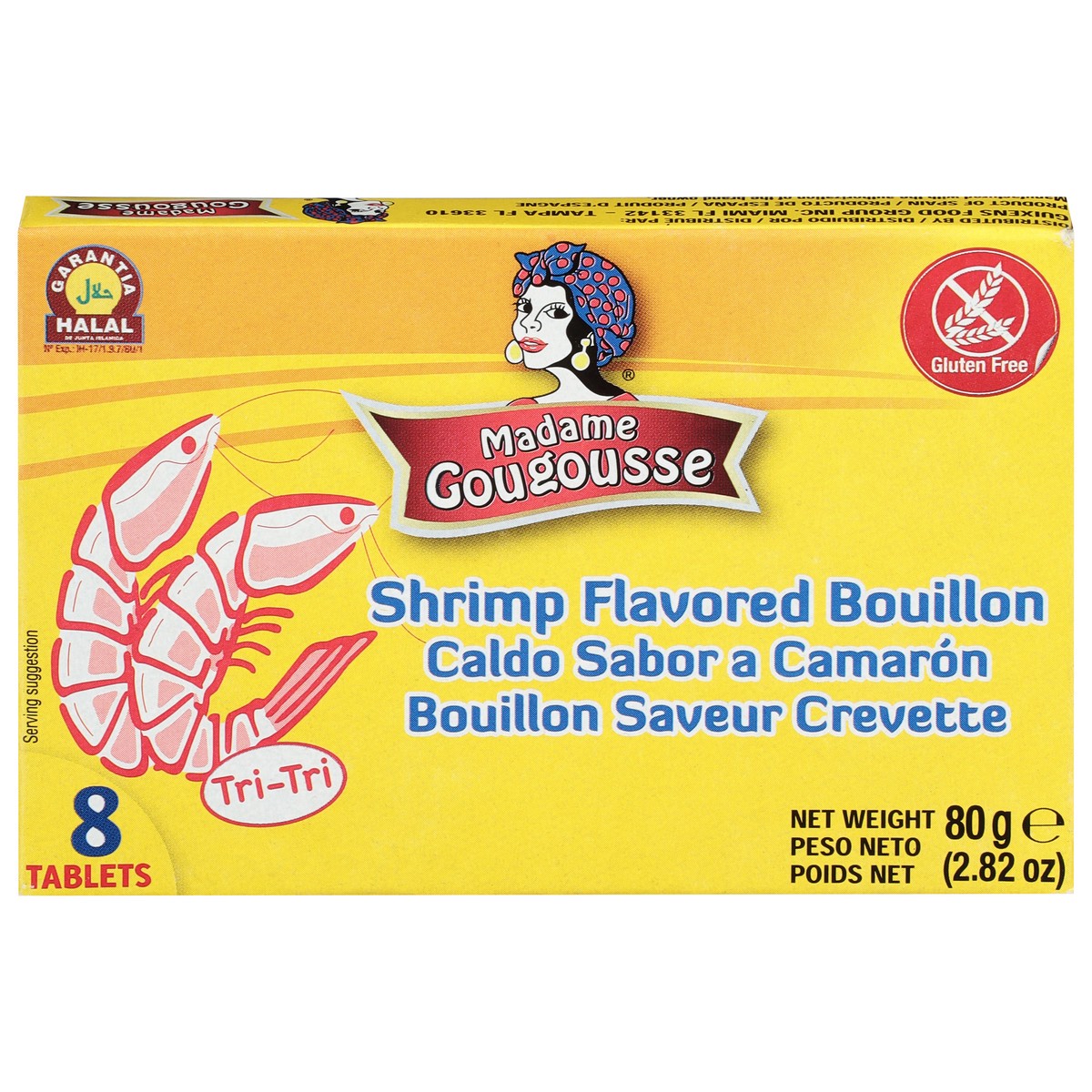 Dehydrated Shrimp Flavored Bouillon: Salt, Corn Starch, Flavour Enhancer (Monosodium Glutamate), Sugar, Palm Oil, Hydrolysed Vegetable Protein (with Soy), Dehydrated Shrimp (Crustaceans, with Molluscs…