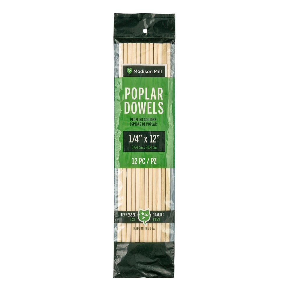 Package includes 12 pieces of 1/4-in x 12-in poplar dowels; Precision-milled from solid poplar to fit your project’s needs – true-to-size, smooth, clear-grained and straight. 100% Made in USA from gen…
