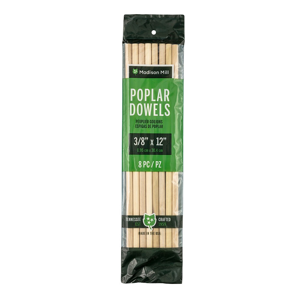 Package includes 8 pieces of 3/8-in x 12-in poplar dowels; Precision-milled from solid poplar to fit your project’s needs – true-to-size, smooth, clear-grained and straight. 100% Made in USA from genu…