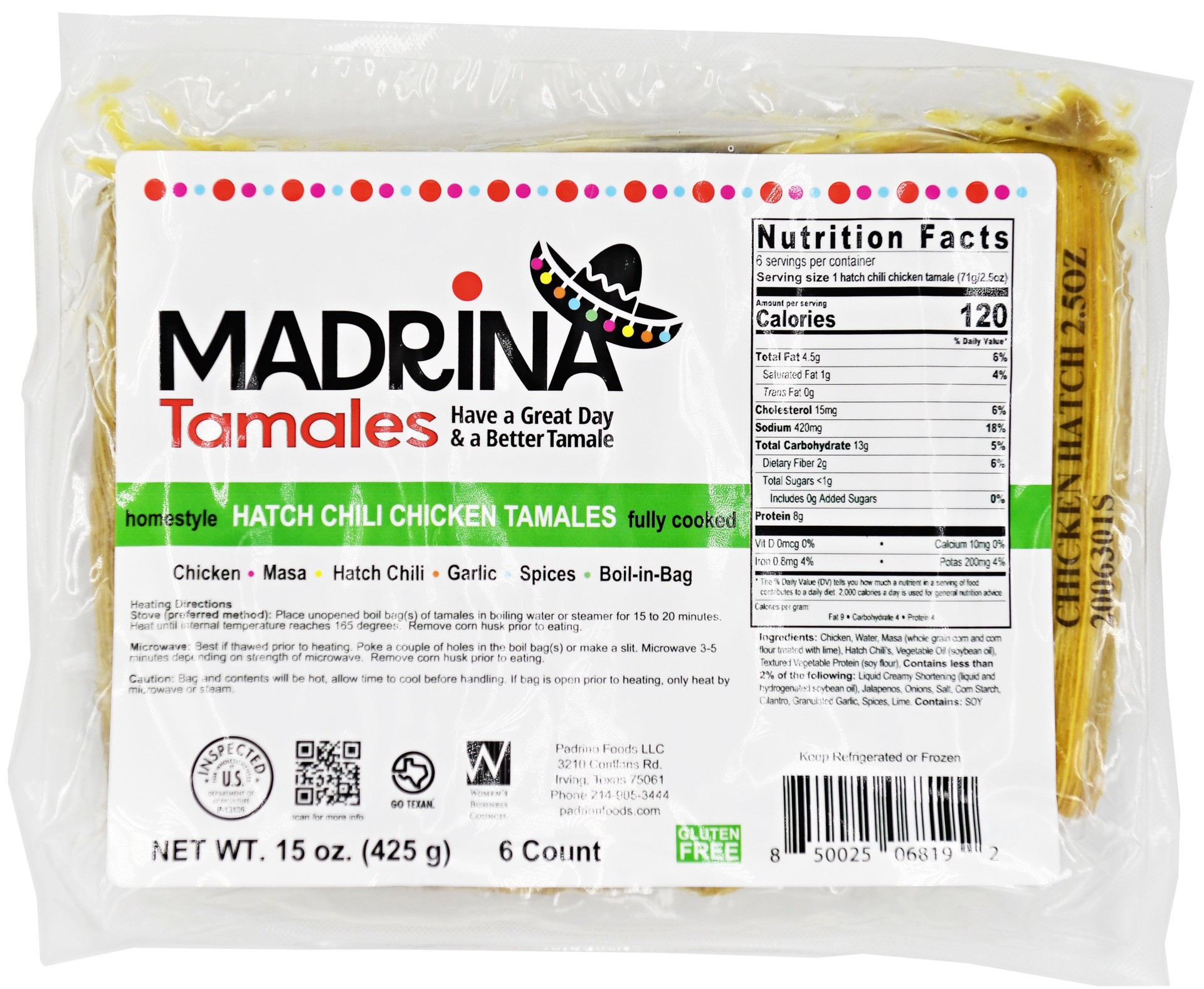 Authentic hand rolled in fresh corn husk Chicken Hatch Tamale made in Texas.All tamales are made from fresh ingredients.Tamales come packaged in a boil bag for ease of cooking and to maintain the fres…