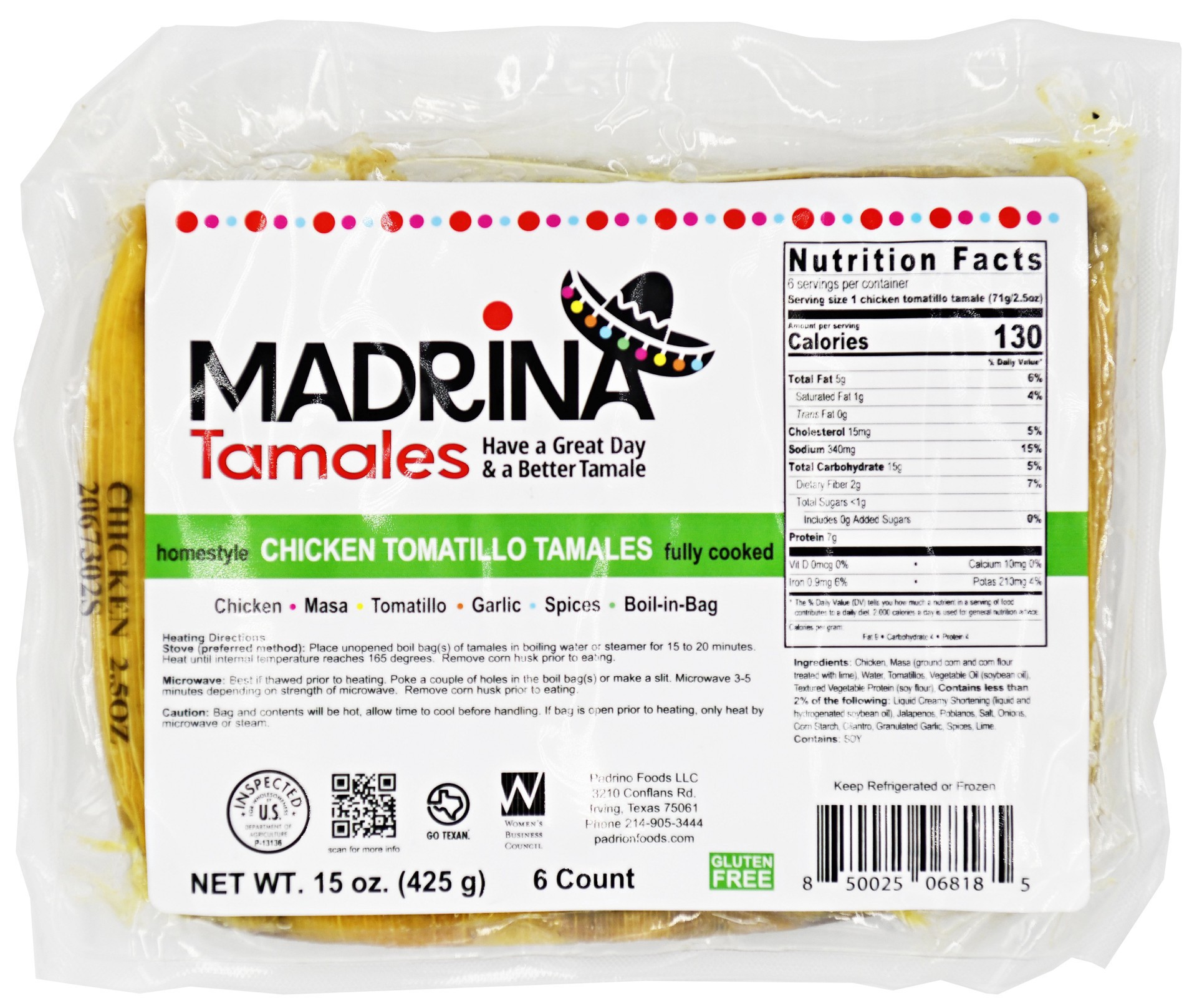 Authentic hand rolled in fresh corn husk Chicken Tomatillo Tamale made in Texas.All tamales are made from fresh ingredients.Tamales come packaged in a boil bag for ease of cooking and to maintain the …