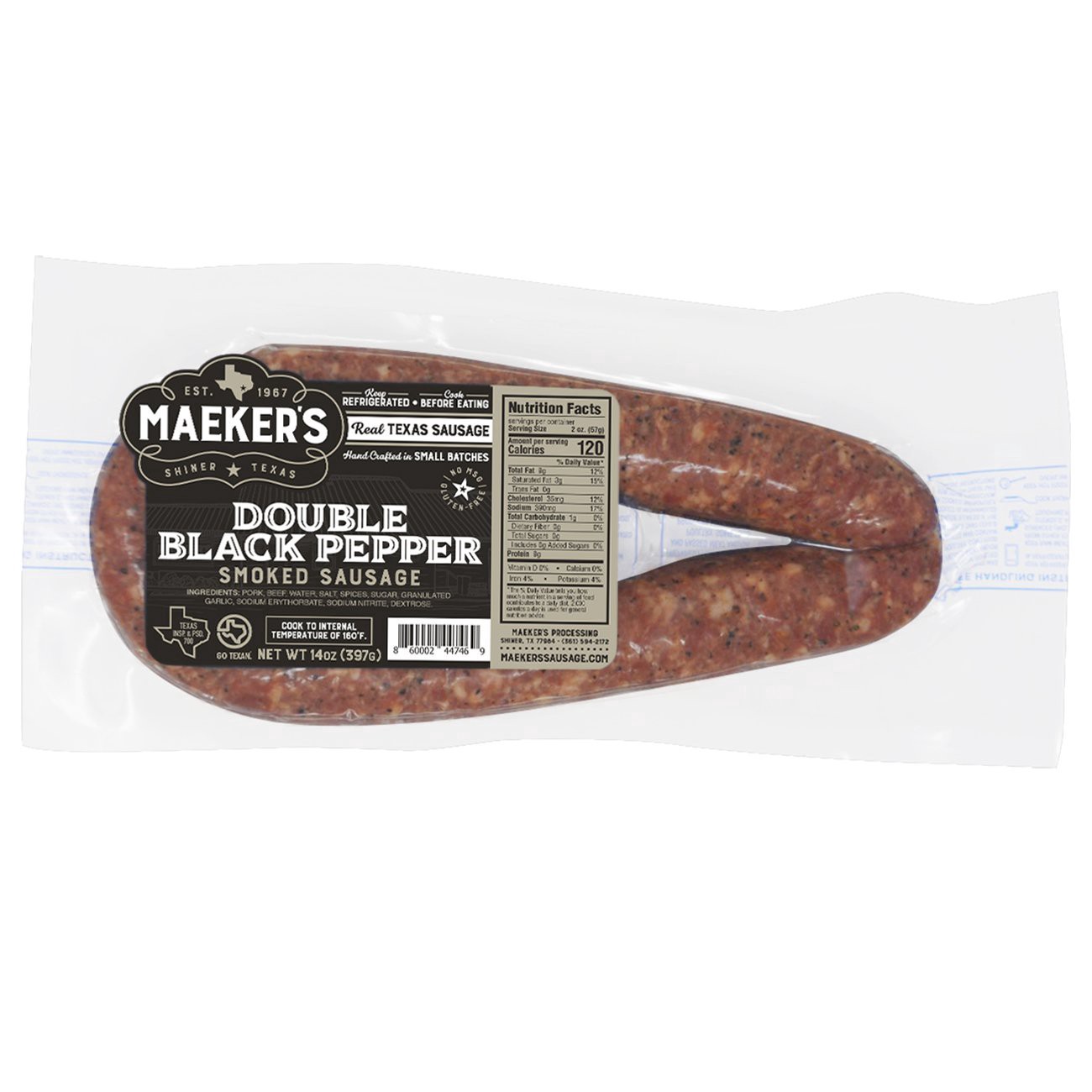 Maekers Double Black Smoked Sausage is made with only high quality, whole muscled proteins, no trimmings, and superior spices. It is hand crafted in small batches in Shiner, TX The cleanest little cit…