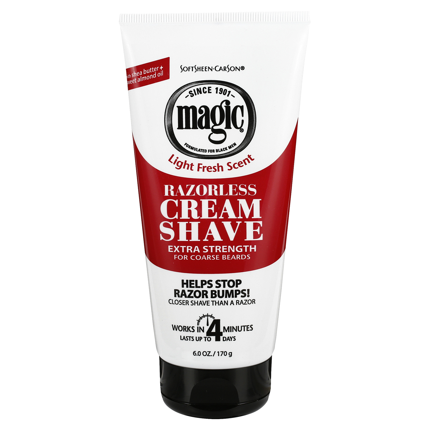 Razorless cream shave formulated to help stop razor bumps and give a closer shave than a razor. With a light fresh scent. Works in 4 minutes and lasts for 4 days. Extra Strength formula for coarse bea…