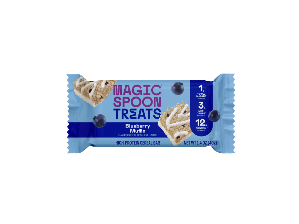 Indulge in the classic bakery favorite with Magic Spoon High-Protein Blueberry Muffin Cereal Treat Bar. Each bite is a delightful combination of fresh blueberries, white chocolatey frosting, and a pro…