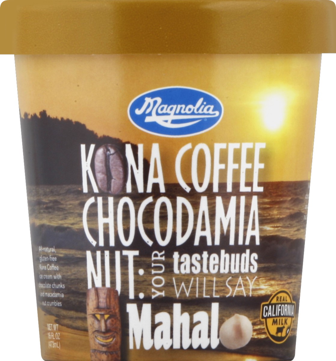 All-natural, gluten-free Kona Coffee ice cream with chocolate chunks and macadamia and crumbles. Kona Coffee Chocodamia Nut: Your tastebuds will say Mahal. Real California milk. No artificial ingredie…