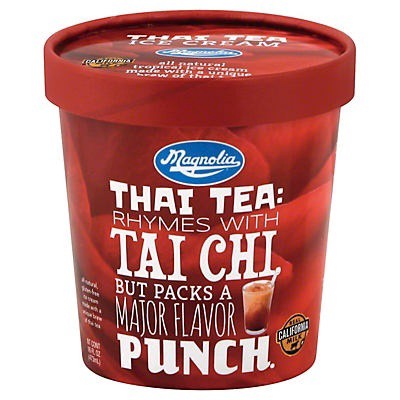 All natural, gluten-free ice cream made with a unique brew of Thai tea. Thai Tea: rhymes with tai chi but packs a major flavor punch. Real California milk. All natural tropical ice cream made with a u…