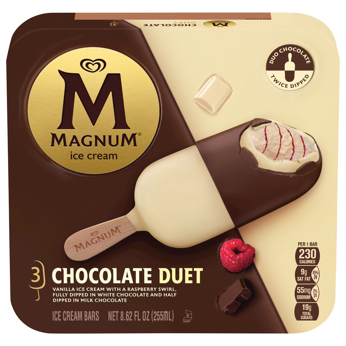 Magnum Chocolate Duet Ice Cream bars offer the ultimate indulgence Each ice cream bar is made with velvety smooth vanilla ice cream and is fully dipped in white chocolate and half dipped in milk choco…