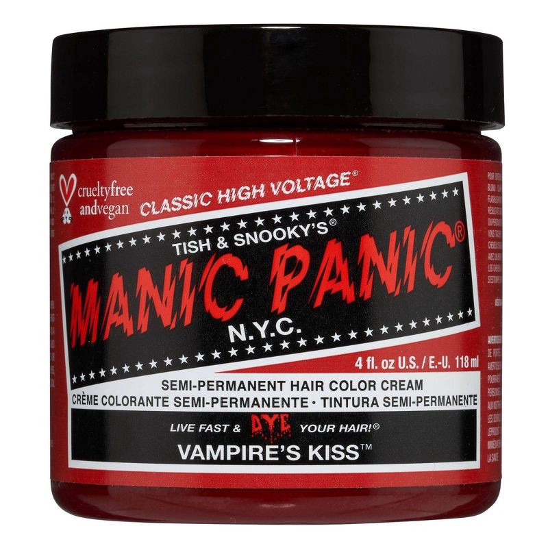"Vampire's Kiss® is a rich, medium red hair dye with bright pink undertones. This semi-permanent shade from Manic Panic's Classic High Voltage line delivers a statement-making red with a kiss of fuchs…