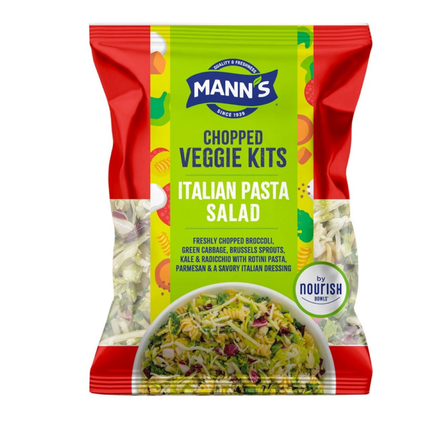 Mann's Chopped Veggie Kit Italian Past Salad - Freshly chopped broccoli, cabbage, brussel sprouts, kale and radicchio with pasta, parm and Italian dressing