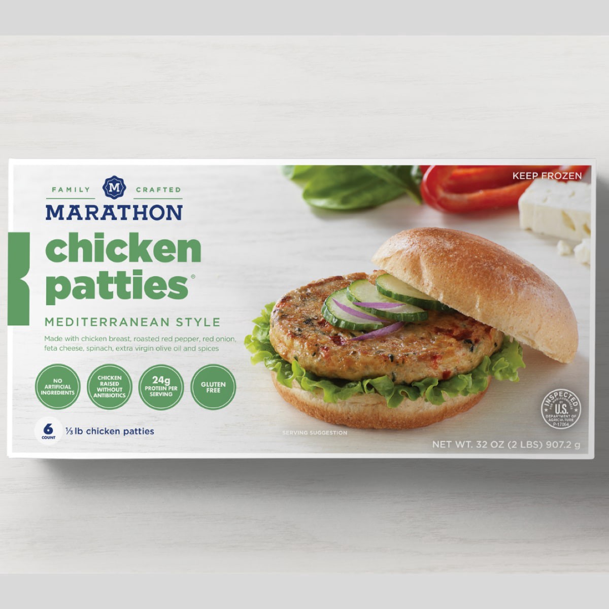 1/3 lb gourmet chicken spinach feta patties. 190 calories per 5.33 oz serving. 24 grams of protein per 5.33 oz serving. 7 grams of fat per 5.33 oz serving. Gluten free. Inspected for wholesomeness by …