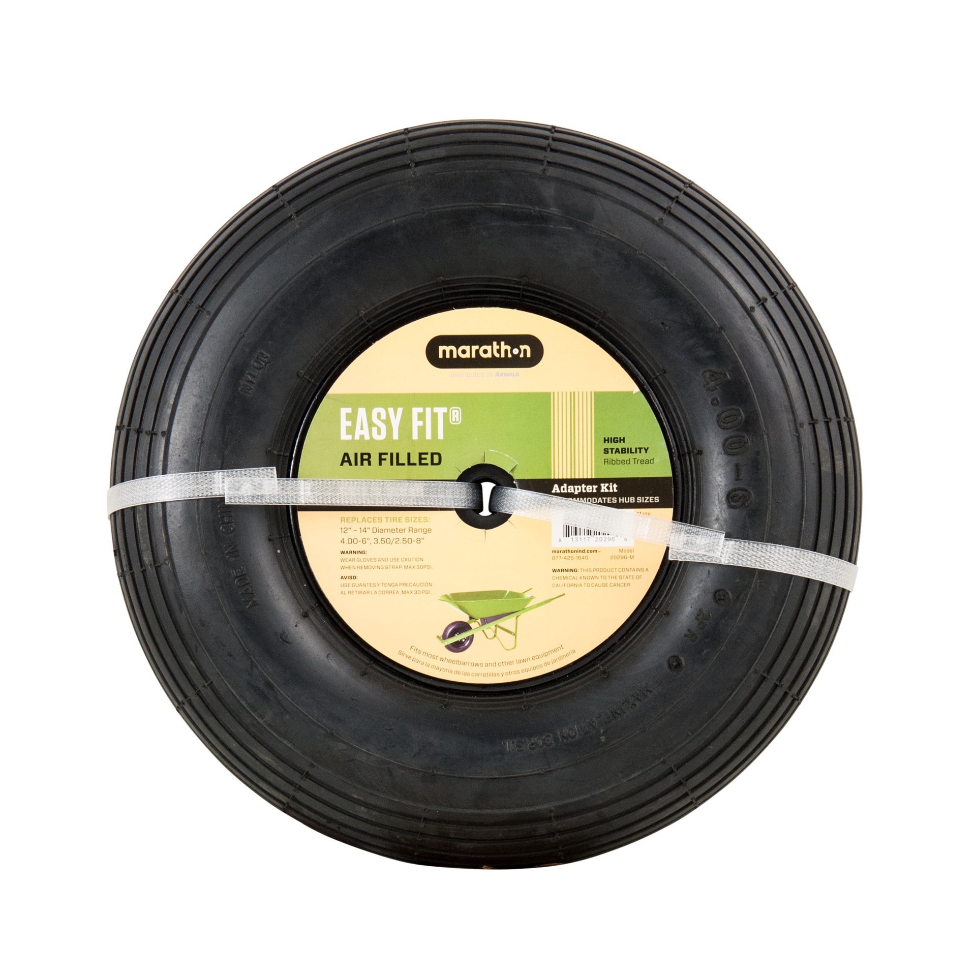 Properly inflated tires last longer, provide better traction and aid in level cutting. Marathon 350 or 250 x 8-in and 400 x 6, 13-in pneumatic wheel. 300 lb load rating. Fits 1.75-in, 3-in or 6-in hub…