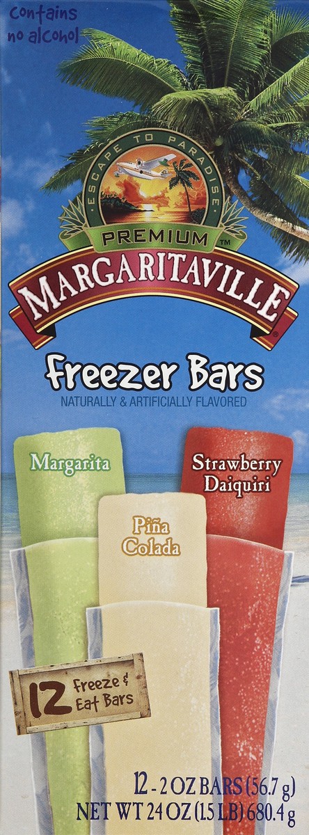 Freeze & eat bars. Margarita. Strawberry Daiquiri. Pina Colada. Premium. Naturally & artificially flavored. Escape to paradise. Contains no alcohol. 100% satisfaction guaranteed. www.jelsert.com. Ques…