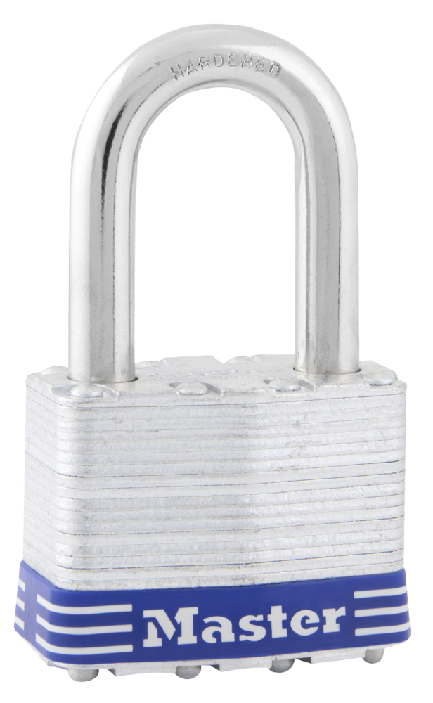 The Master Lock No. 5DLF Laminated Padlock features a 2in 51mm wide laminated steel body for maximum strength and reliability. The 38in 10mm diameter shackle is 112in 38mm long and made of hardened bo…