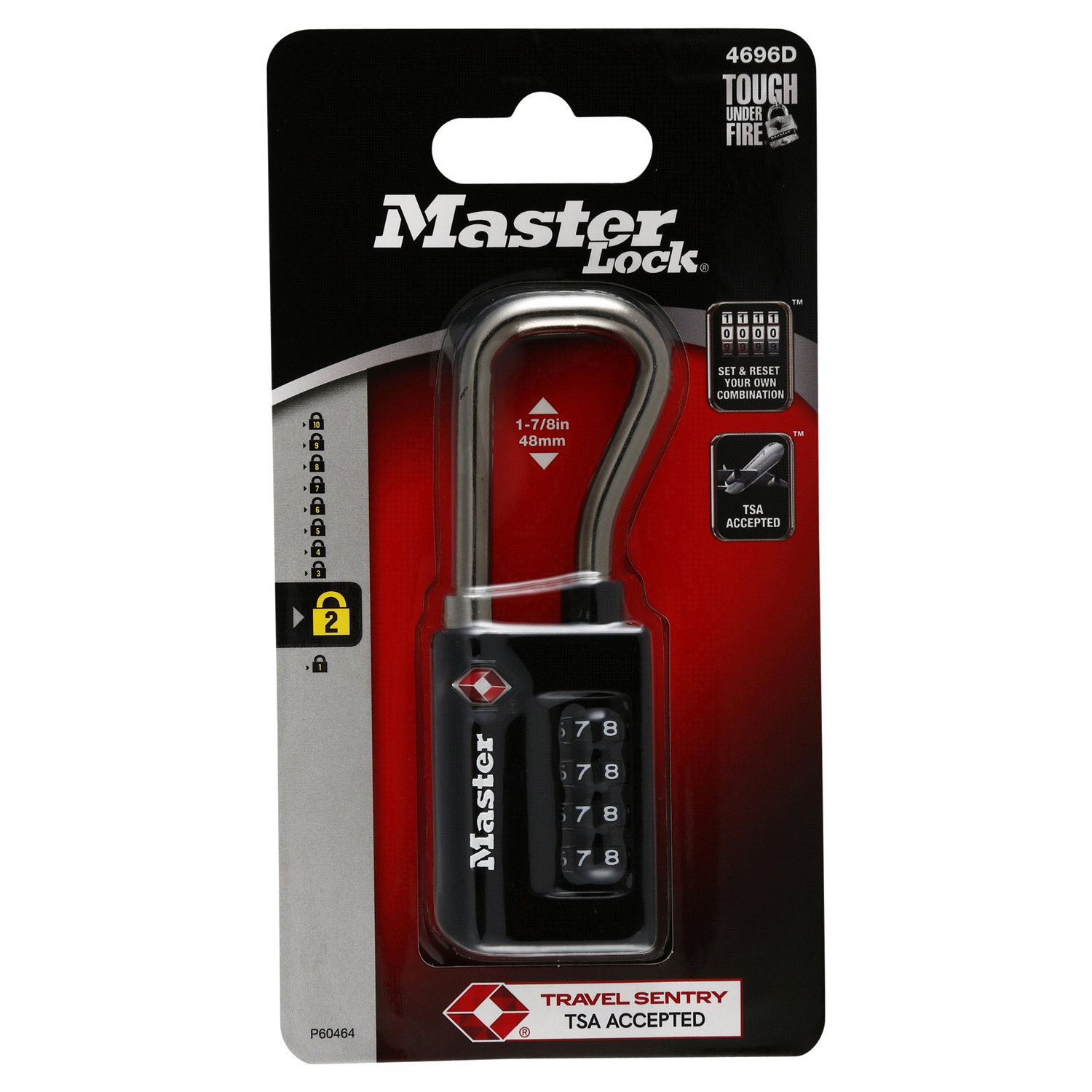 The Master Lock No. 4696D Set Your Own Combination TSA-Accepted Luggage Lock features a 1-5/16 inch (35mm) wide metal body for durability. nThe 1/4 inch (6mm) diameter shackle is 1-7/8 inch (48mm) lon…