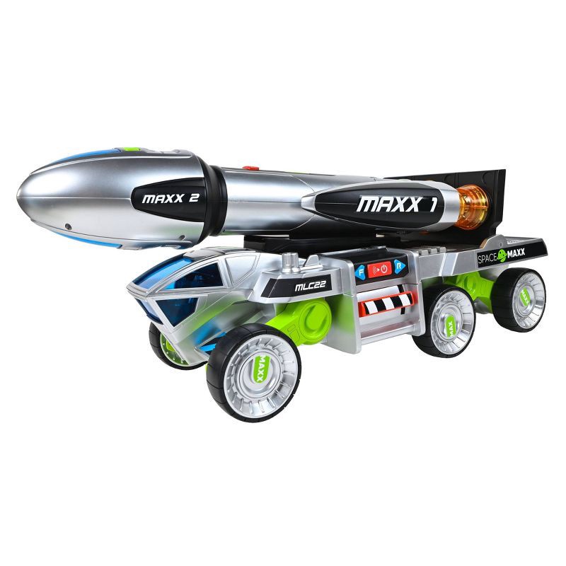 Get ready to launch playtime out of this world with the Space Maxx 3-N-1 Rocket Transport Vehicle! Measuring over 2 feet long and equipped with flashing lights and sounds, the rocket transport set com…