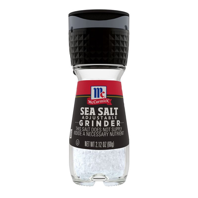- Sea salt naturally harvested from the MediterraneanAdjustable grinder conveniently offers coarse, medium or fine grind; not refillableTo use: remove cap, adjust grinder to desired grind, turn upside down and twistMcCormick Seasoning Grinder glass bottles are recyclable; remove grinder head firstUse coarse grind for bold texture in meat rubs or on top of caramels