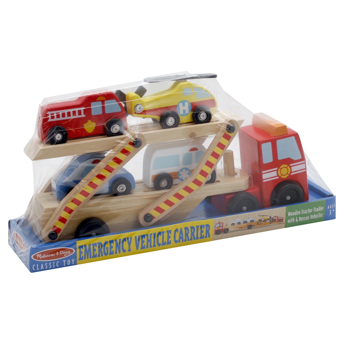 This giant two-level tractor-trailer comes stocked with four wooden emergency vehicles and delivers unlimited play possibilities! Lower the upper deck to extend the truck to nearly two feet long and t…