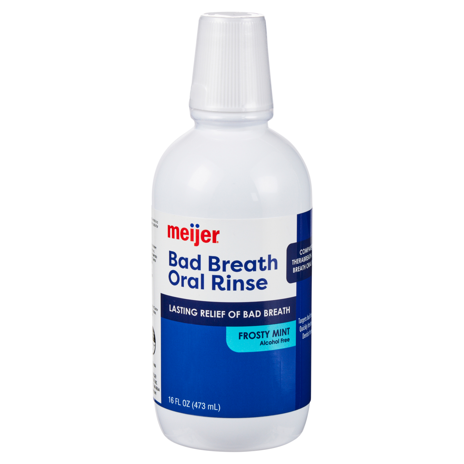 Meijer Bad Breath Oral Rinse attacks the germs that cause bad breath leaving a fresh and vibrant Frosty Mint flavor, while assisting in the maintenance of overall oral health.